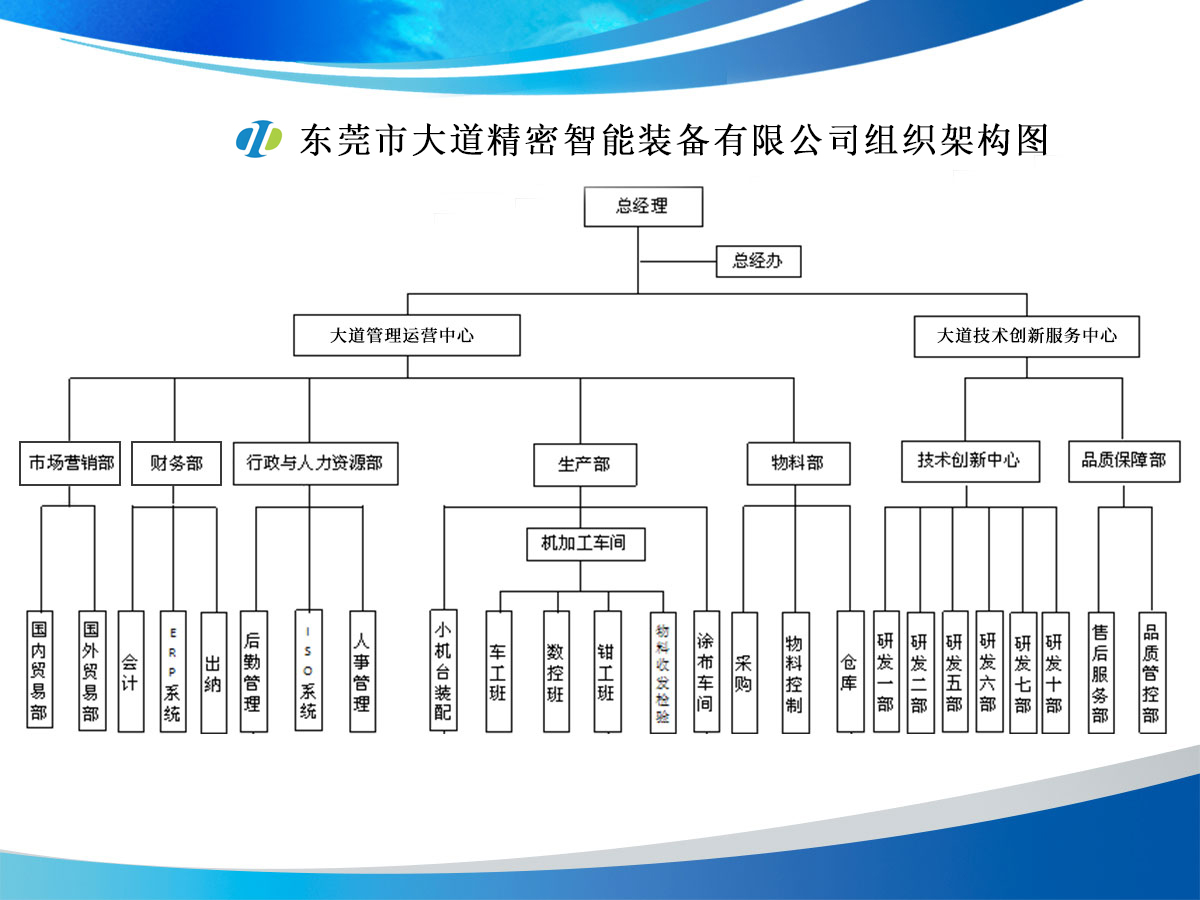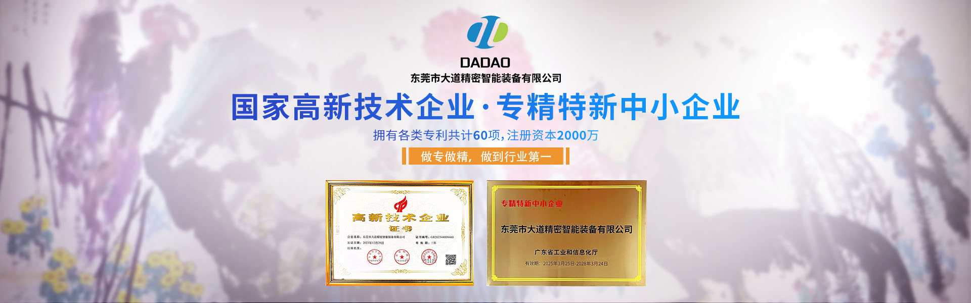 大道精密成立于2019年,公司注冊資本1000萬元,擁有辦公室、廠房等18,000多平方米。已通過ISO9001:2015國際質(zhì)量管理體系認證,擁有國家各類專利共計58項,獲得“中國大道.商標”和“一帶一路十周年 .國禮品牌”等榮譽稱號,屬于國家高新技術(shù)企業(yè),專精特新中小企業(yè)。2023年4月成立了“東莞市大道精密智能裝備有限公司關(guān)心下一代工作委員會”,是東莞市企石鎮(zhèn)工商聯(lián)副會長單位、東莞市企石鎮(zhèn)文學藝術(shù)界聯(lián)合會副主席單位、東莞市環(huán)保包裝行業(yè)協(xié)會副會長單位、東莞市數(shù)控裝備行業(yè)協(xié)會第二屆會長單位、廣東省包裝技術(shù)協(xié)會常務理事單位、廣東省膠粘劑行業(yè)協(xié)會理事單位、國家標準《機械安全中安全防護授權(quán)系統(tǒng)的基本要求》起草單位。
